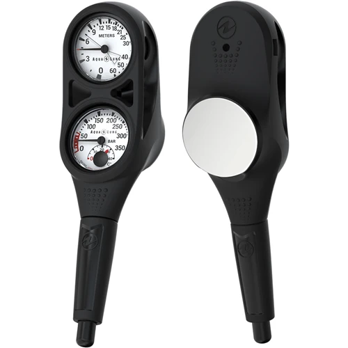 The Aqualung two-gauge console includes a pressure gauge and a depth gauge. Designed with ease-of-use and simplicity in mind, the pressure and depth gauge displays have a luminescent gauge face for easy reading in low light. You can easily add a compass to this console. Remaining air pressure and temperature in one easy-to-read display. Rated to 5,000 psi. High fidelity depth scale provides accurate and easier reading at shallow depths. Maximum depth indicator with a 200 foot maximum depth.
