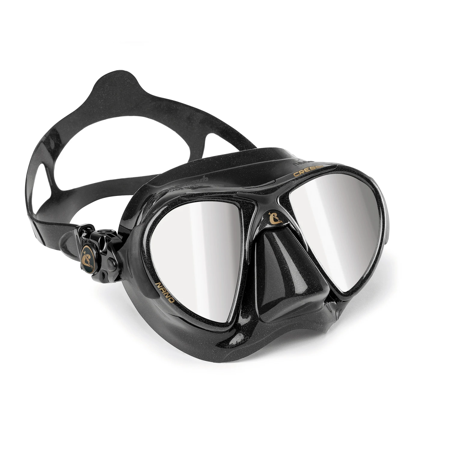 The Cressi Nano Black Mask, Two Lens (Mirrored) is designed to offer an extremely hydrodynamic and compact shape to help divers cut through the water and aid movements in small spaces. The low volume of this mask makes it ideal for freediving and spearfishing, as well as hydrodynamically adequate for scuba diving. The Cressi Nano Black Mirrored Mask is designed to offer an extremely hydrodynamic and compact shape to help divers cut through the water and aid movements in small spaces. The low volume of this mask makes it ideal for freediving and spearfishing, as well as scuba diving.