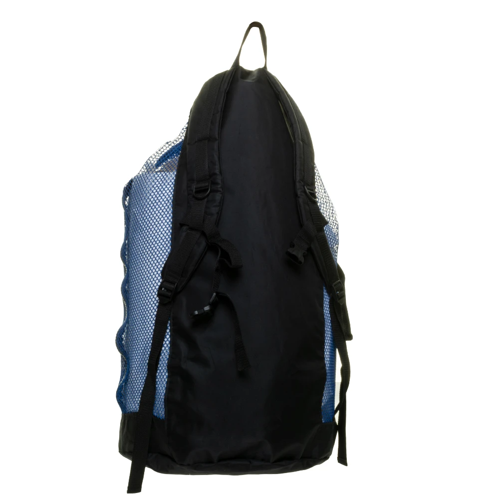 The EVO Deluxe Mesh Backpack Dive Bag is made from heavy duty mesh and PVC coated 420D nylon with contoured padded straps for comfort. The full length zipper that runs down the mesh bag side allows easy loading and unloading when you don’t want to open the drawstring top. A large pocket with hook and loop closure on the front allows you to keep smaller items within easy reach and makes it easy to locate them. Truly the perfect lightweight mesh dive bag, this bag will easily hold the items you want to take along for a day of diving or a day on the beach.