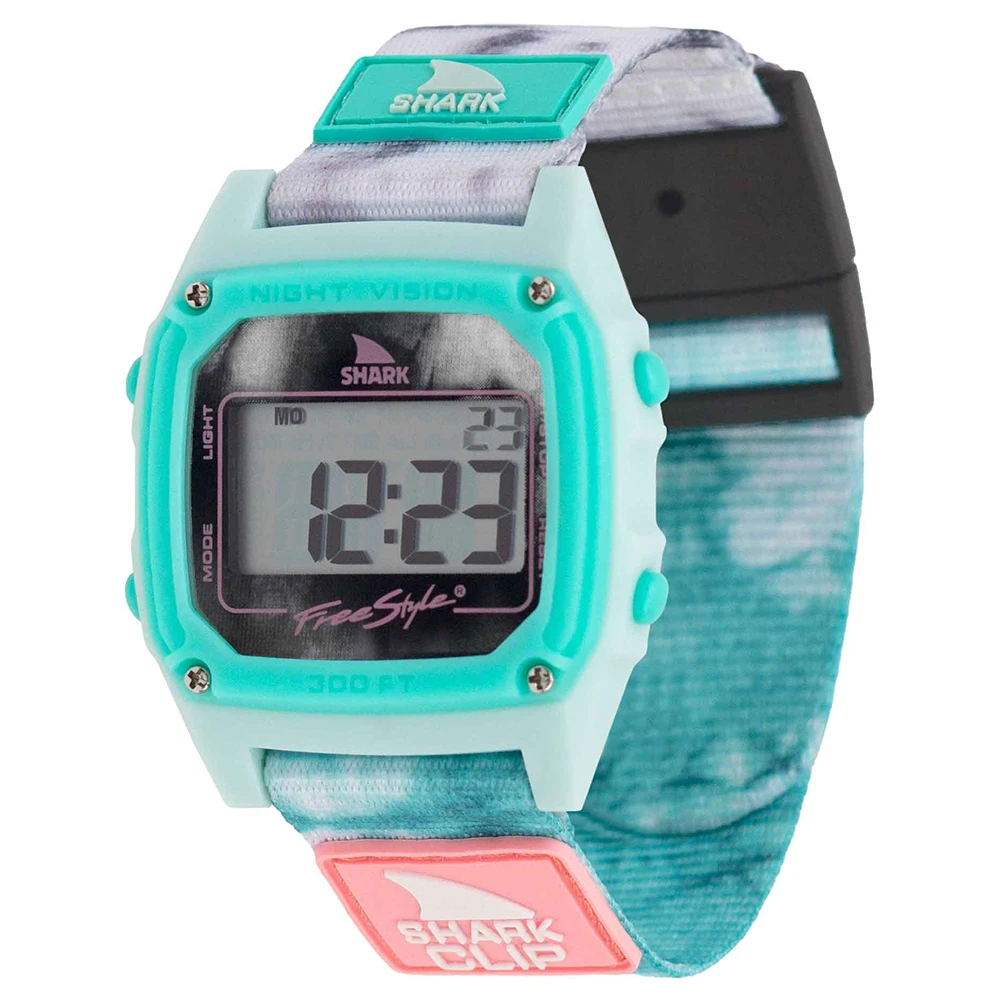 You might just feel like you’re floating on a cloud when you wear your Freestyle Shark Classic Clip Watch in Tie Dye Aqua Cloud. Don’t let the soft colors fool you, this digital watch is built to perform. In classic Freestyle form, the clip closure secures your watch in place and the polyester band works to ensure it stays put, even if you’re out in the water. And yes, this watch goes in the water with water resistance up to 100 meters. Explore on.