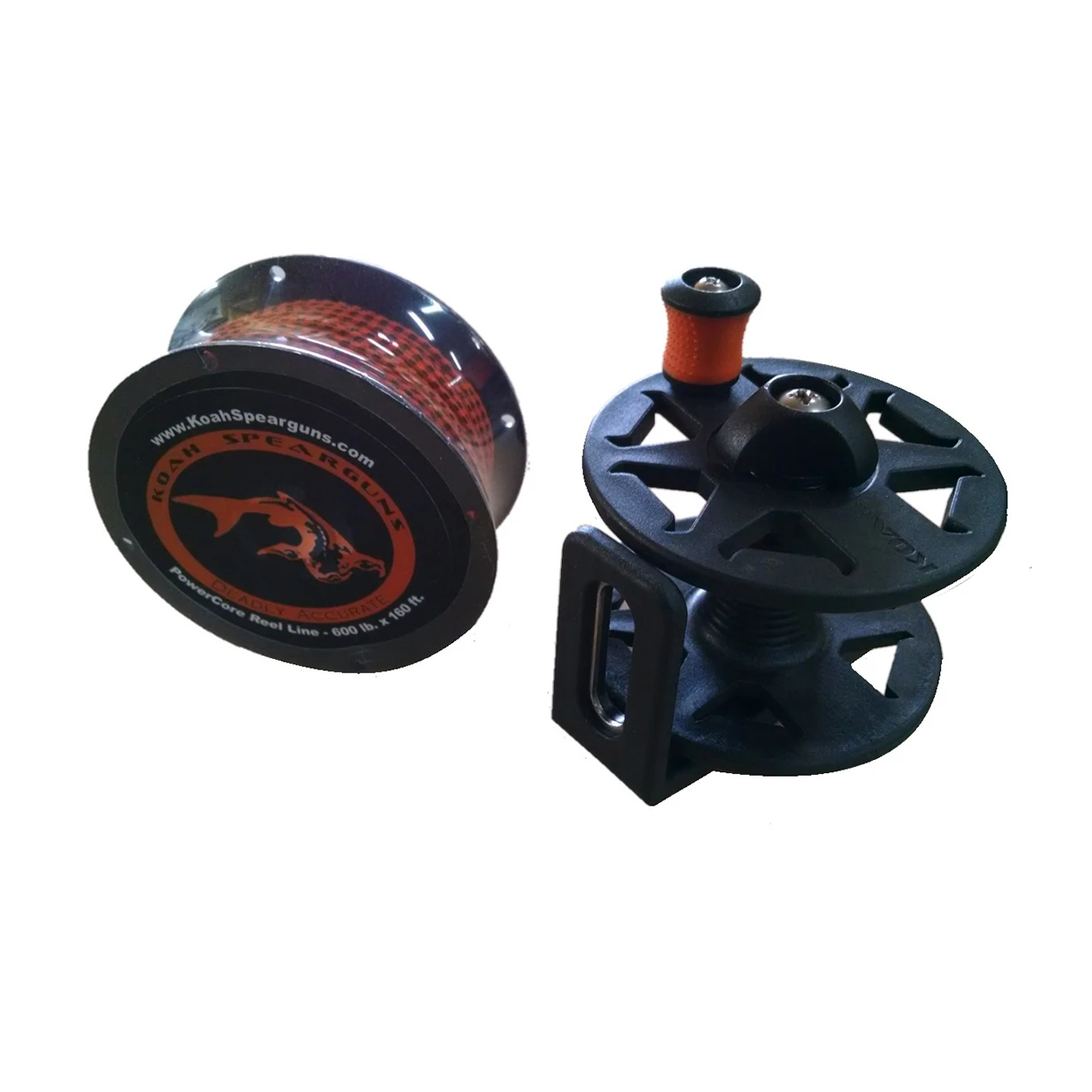 Quick and easy to mount, the Koah RSC 60M Reel with Powercore Line sets you up right for spearfishing success. Durable, heavy-duty reel features a smooth moving handle with silicone knob, plus a ribbed center wheel to prevent line slippage. This reel is perfect to catch fish over 50lbs or to spearfish in deep waters. Mount it to the side of your speargun or use the flat slide-on base for quick on/off. Includes 160’ of heavy-duty Koah Powercore line.