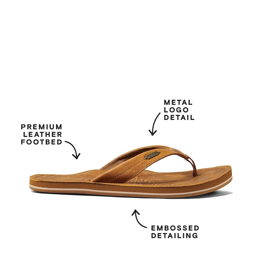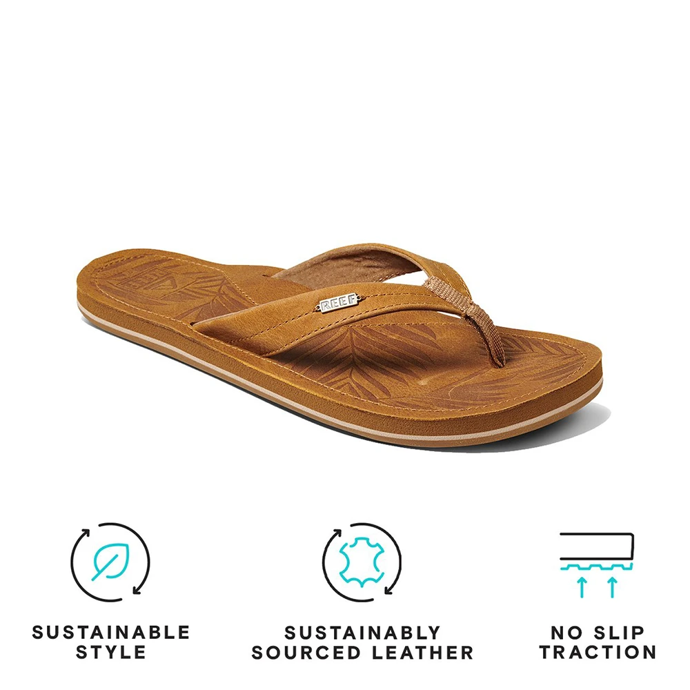 Super cute with a palm frond design on the footbed, the Reef Drift Away Leather Sandals go with everything. Full grain leather straps that are sustainably sourced sport a metal logo detail giving these flip flops that little extra sustainable style. Palm fronds embossed on the footbed will have you thinking of the islands every time you slip your foot into these super comfy sandals. That rubber outsole keeps you on your feet with no slip traction and a palm frond-inspired design on the soles.