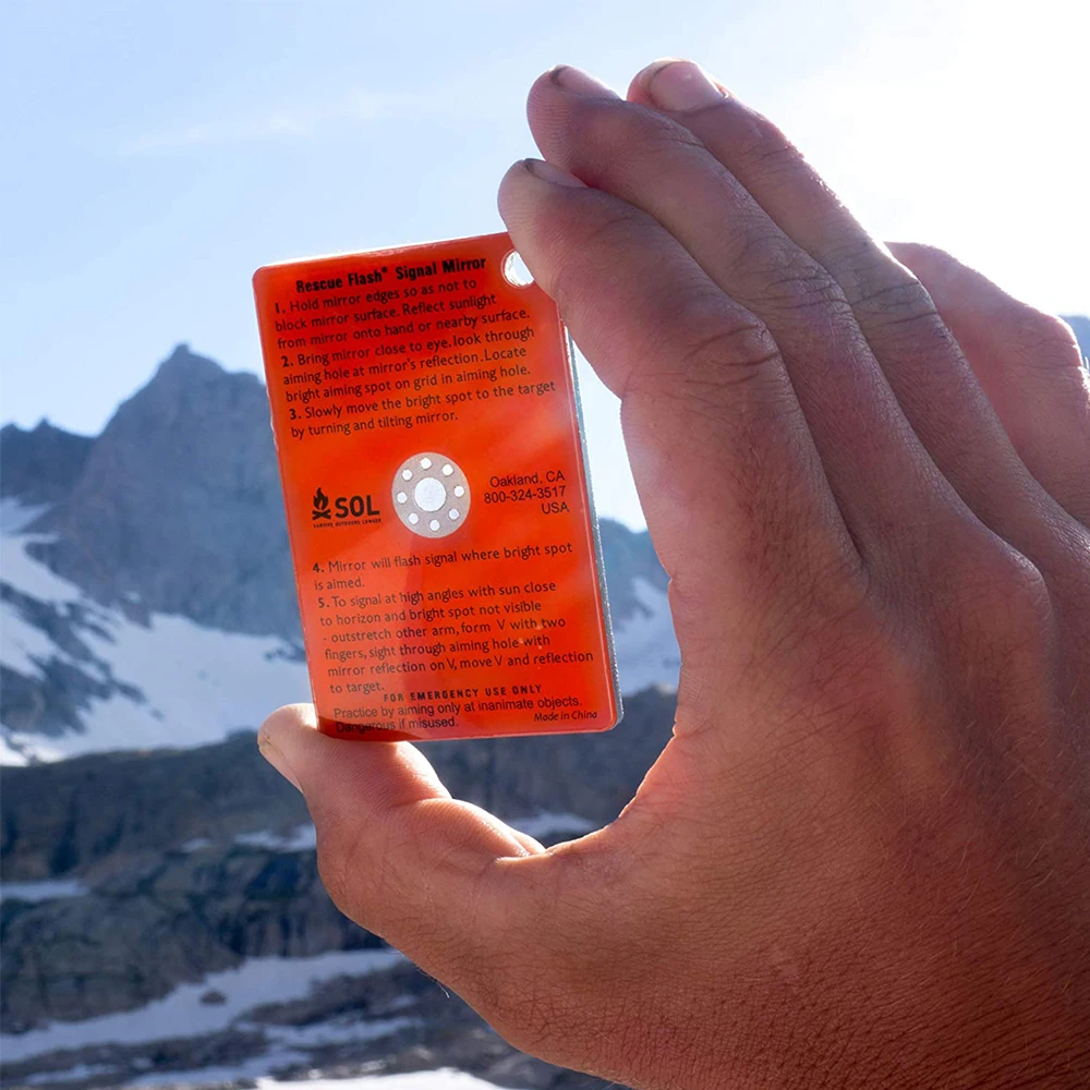 The Rescue Flash Signal Mirror is an ultralight, unbreakable safety mirror that sends a signal visible up to 30 miles away. The reflective mil-spec style mirror gives you pin-point accuracy when signaling distant targets. Constructed from durable polycarbonate, this mirror will never crack or break if dropped. Small size even allows for one-handed use. Tucks easily into your BC pocket.