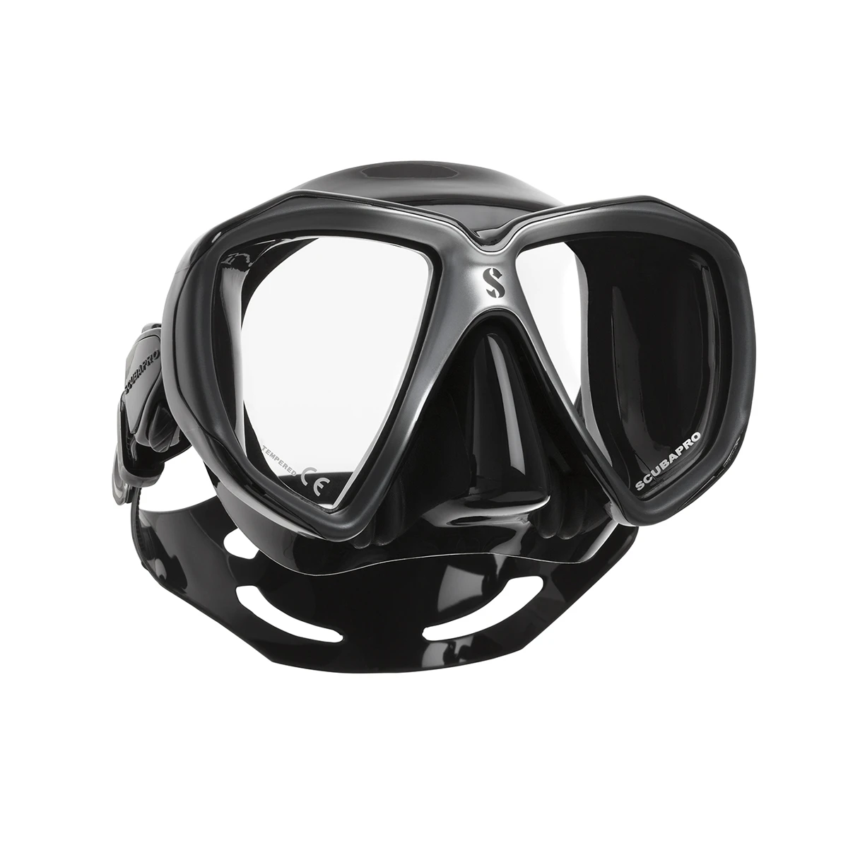 The ScubaPro Spectra Mask, Two Lens is both stylish and dependable. It’s designed to comfortably fit medium and large faces in a variety of shapes thanks to the water-blocking, high-quality silicone skirt. The skirt provides a secure seal so you can focus on the world around you. The low volume of this mask makes it easy to clear, especially with the EZ equalizer nose pocket. Its tempered glass lenses are safe, durable, and built to last. They provide a large field of view to give a front row seat to the underwater scenery. The buckles are attached to the mask skirt for a more natural strap angle and a more secure, comfy fit. Adjustable push buttons give you finely tuned control over mask tightness. When diving time’s over, just fold this mask for easy storage.
