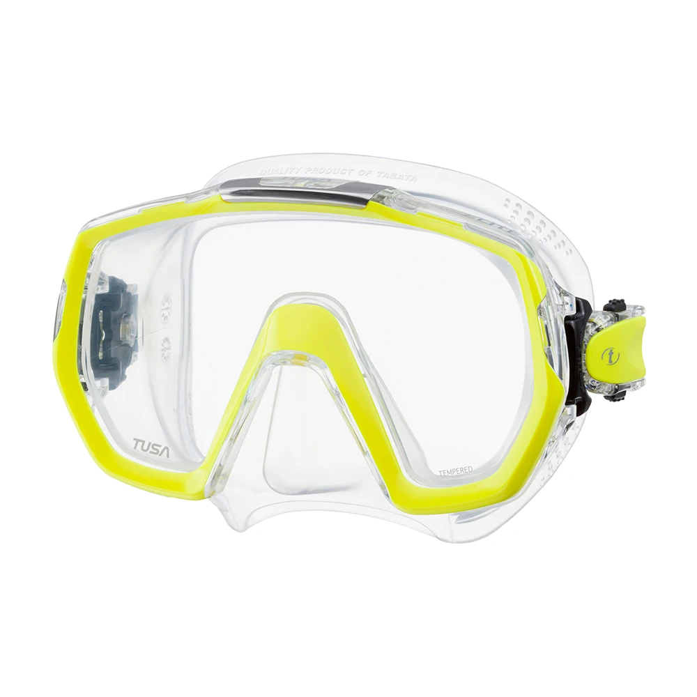 Enjoy all the views of the underwater world with this wide field of view, single lens scuba mask from TUSA. The TUSA Freedom Elite Mask, Single Lens uses several technological features to improve comfort and function. Freedom technology enhances the comfort, fit, and performance of your scuba mask by dimpling the mask skirt and varying the thickness of the silicone. Stability ridges paired with the low-friction mask skirt surface improve comfort on the fitting line. A 180° buckle system rotates to fully adjust to all head sizes.