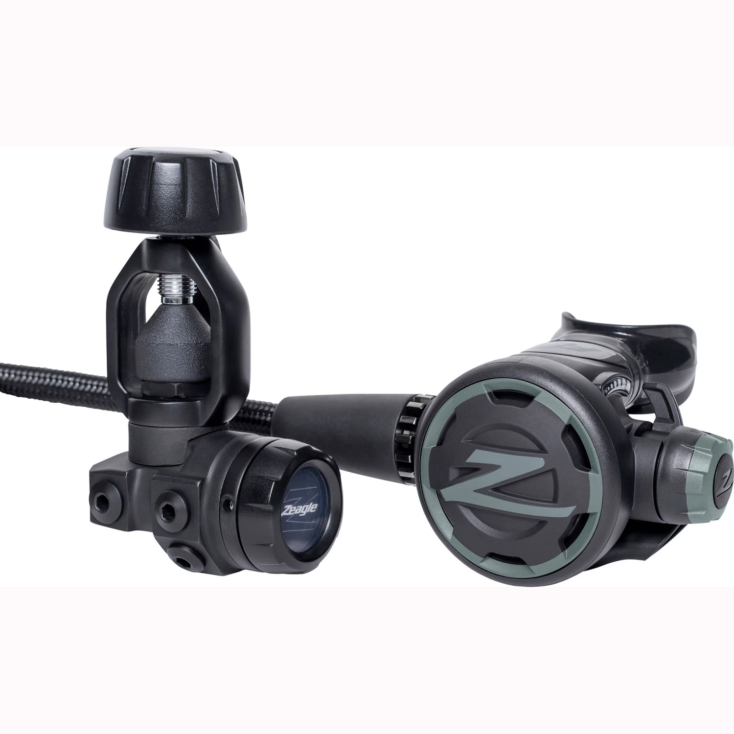 A high-performing, travel-friendly regulator, the Zeagle F8 Scuba Regulator provides an exceptional breathing experience from a diaphragm scuba regulator. The first stage of the regulator includes a dry-sealed spring chamber to prevent freezing in frigid waters, so it can even be used for cold water diving. Delicate components of the first stage are environmentally sealed off from contaminants and salt effects. This low profile regulator weighs just 2.6 lbs dry, making it great for travel. It barely extends above the tank valve when in use. The low-pressure hose ports are connected directly from the sides, for an ideal configuration. The conical precision high-pressure valve is highly reliable, providing a long service life while still delivering impressive breathing responsiveness and performance. With its 2 year or 200 dive service interval, the Zeagle F8 Scuba Regulator is a great addition to your scuba gear.